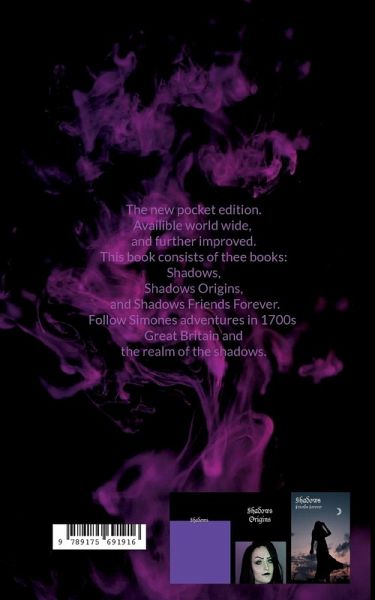 The new pocket edition.Availible world wide, further improved, and at a better price than ever.This book consists of thee books:Shadows. Shadows Origins. and Shadows friends forever.Follow Simones adventures in 1700s Great Britain andthe realm of the shadows.