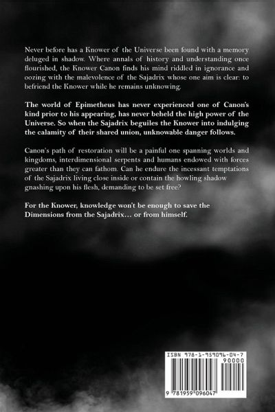 Never before has a Knower of the Universe been found with a memory deluged in shadow. Where annals of history and understanding once flourished, the Knower Canon finds his mind riddled in ignorance and oozing with the malevolence of the Sajadrix whose one aim is clear: to befriend the Knower while he remains unknowing. The Dimension of Epimetheus has never experienced one of Canon's kind prior to his appearing, has never beheld the high power of the Universe. So when the Sajadrix beguiles the Knower into indulging the calamity of their shared union, unknowable danger follows. Canon's path of restoration will be a painful one spanning worlds and kingdoms, inter-dimensional serpents and humans endowed with forces greater than they can fathom. Can he endure the incessant temptations of the Sajadrix living close inside or contain the howling shadow gnashing upon his flesh, demanding to be set free? For the Knower, knowledge won't be enough to save the Dimensions from the Sajadrix... or from himself.