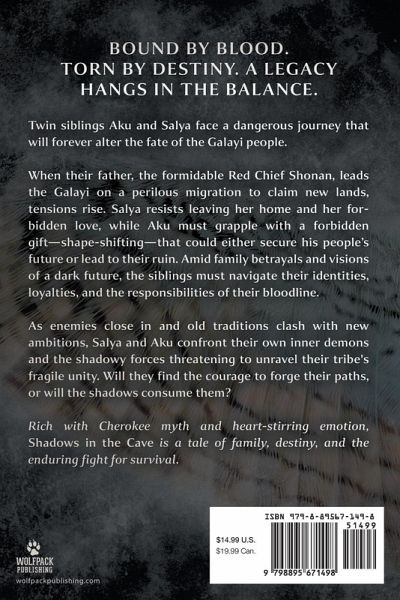 Bound by blood. Torn by destiny. A legacy hangs in the balance. Twin siblings Aku and Salya face a dangerous journey that will forever alter the fate of the Galayi people. When their father, the formidable Red Chief Shonan, leads the Galayi on a perilous migration to claim new lands, tensions rise. Salya resists leaving her home and her forbidden love, while Aku must grapple with a forbidden gift-shape-shifting-that could either secure his people's future or lead to their ruin. Amid family betrayals and visions of a dark future, the siblings must navigate their identities, loyalties, and the responsibilities of their bloodline. As enemies close in and old traditions clash with new ambitions, Salya and Aku confront their own inner demons and the shadowy forces threatening to unravel their tribe's fragile unity. Will they find the courage to forge their paths, or will the shadows consume them? Rich with Cherokee myth and heart-stirring emotion, Shadows in the Cave is a tale of family, destiny, and the enduring fight for survival.