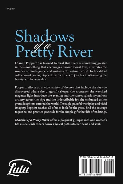 Dianne Poppert has learned to trust that there is something greater in life-something that encourages unconditional love, illustrates the wonder of God's grace, and sustains the natural world. In her debut collection of poems, Poppert invites others to join her in witnessing the beauty within every day. Poppert reflects on a wide variety of themes that include the day she discovered where the dragonfly sleeps; the moments she watched magenta light introduce the evening and the sunset splash mysterious artistry across the sky; and the indescribable joy she embraced as her granddaughters entered the world. Through graceful wordplay and vivid imagery, Poppert teaches all of us to look for the good, find the courage to just be, and practice gratitude for the simple gifts that life often brings. Shadows of a Pretty River offers a poignant glimpse into one woman's life as she leads others down a lyrical path into her heart and soul.