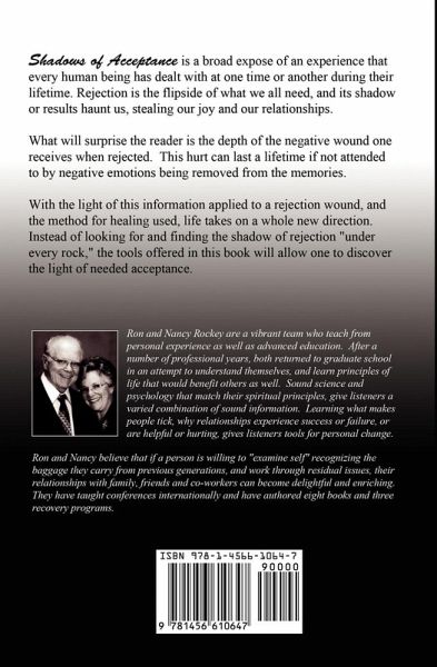 Shadows of Acceptance is a broad expose of an experience that every human being has dealt with at one time or another during their lifetime. Rejection is the flipside of what we all need, and its shadow or results haunt us, stealing our joy and our relationships. What will surprise the reader is the depth of the negative wound one receives when rejected. This hurt can last a lifetime if not attended to by negative emotions being removed from the memories. With the light of this information applied to a rejection wound, and the method for healing used, life takes on a whole new direction. Instead of looking for and finding the shadow of rejection "under every rock," the tools offered in this book will allow one to discover the light of needed acceptance.