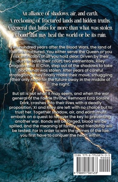 Two hundred years after the Blood Wars, the land of Faerie is fractured. You either serve the Queen or you risk extinction of all you hold dear. Driven by their duty to save their court, two elementals, Riley Dragoon and Xi Chin, step out of the shadows to take back what was stolen. After years of careful strategizing, they finally make their move, smuggling their only hope for the future away in the middle of the night. But all is not what it may seem, and when the war general of the Faerie throne, Remnant Ezra Solaire Dark, crashes into their lives with a deadly proposition, Xi and Riley are left with no choice but to trust her. Together shadow, air, and earth must embark on a quest to recover the key to preventing another war. Bonds will be forged, blood will be spilled, and the meaning of family and friendship will be tested. For in order to win the games of the fae, you first have to conquer the heart within.