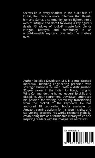Secrets lie in every shadow. The quiet hills of Idukki hold more than just the whispers of the wind. Here, Raju, a man of principle, faces a moral dilemma when confronted with a sinister request from his neighbour David. Refusing to become an assassin, Raju finds himself entangled in a web of intrigue. Meanwhile, Suma, fighting for justice for her community, steps into the limelight after a brutal incident shakes the town. With the death of a key figure, she and Raju are thrust into a labyrinth of deceit. As they peel back layers of lies, they question everything they know. Will their pursuit of truth reveal more than they can handle? 'Shadows of Idukki' is a masterful debut in the mystery genre by the author. With its blend of intrigue, betrayal, and community, this novel promises to be an unputdownable read. Dive into the mystery now.