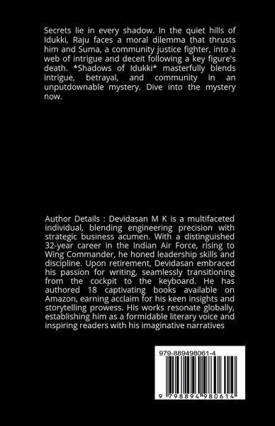 Secrets lie in every shadow. The quiet hills of Idukki hold more than just the whispers of the wind. Here, Raju, a man of principle, faces a moral dilemma when confronted with a sinister request from his neighbour David. Refusing to become an assassin, Raju finds himself entangled in a web of intrigue. Meanwhile, Suma, fighting for justice for her community, steps into the limelight after a brutal incident shakes the town. With the death of a key figure, she and Raju are thrust into a labyrinth of deceit. As they peel back layers of lies, they question everything they know. Will their pursuit of truth reveal more than they can handle? 'Shadows of Idukki' is a masterful debut in the mystery genre by the author. With its blend of intrigue, betrayal, and community, this novel promises to be an unputdownable read. Dive into the mystery now.