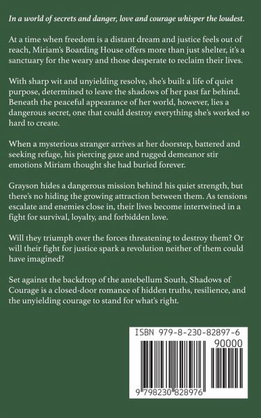 Love and courage whisper the loudest in a world of secrets and danger. At a time when freedom is a distant dream and justice feels out of reach, Miriam's Boarding House offers more than just shelter, it's a sanctuary for the weary and those desperate to reclaim their lives. With sharp wit and unyielding resolve, she's built a life of quiet purpose, determined to leave the shadows of her past far behind. Beneath the peaceful appearance of her world, however, lies a dangerous secret, one that could destroy everything she's worked so hard to create. When a mysterious stranger arrives at her doorstep, battered and seeking refuge, his piercing gaze and rugged demeanor stir emotions Miriam thought she had buried forever. Grayson hides a dangerous mission behind his quiet strength, but there's no hiding the growing attraction between them. As tensions escalate and enemies close in, their lives become intertwined in a fight for survival, loyalty, and forbidden love. Will they triumph over the forces threatening to destroy them? Or will their fight for justice spark a revolution neither could have imagined? Set against the backdrop of the antebellum South, Shadows of Courage is a closed-door romance of hidden truths, resilience, and the unyielding courage to stand for what's right.