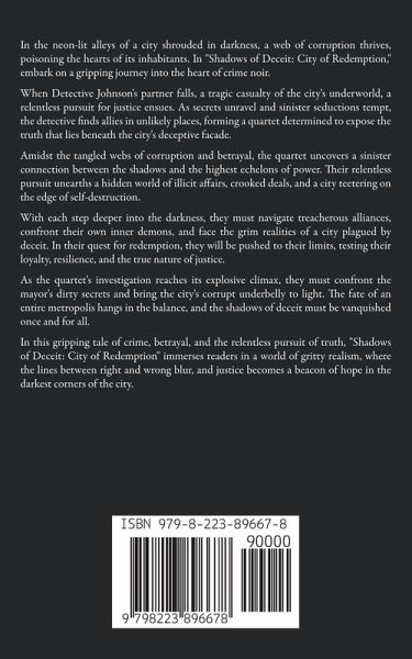 In the neon-lit alleys of a city shrouded in darkness, a web of corruption thrives, poisoning the hearts of its inhabitants. In "Shadows of Deceit: City of Redemption," embark on a gripping journey into the heart of crime noir. When Detective Johnson's partner falls, a tragic casualty of the city's underworld, a relentless pursuit for justice ensues. As secrets unravel and sinister seductions tempt, the detective finds allies in unlikely places, forming a quartet determined to expose the truth that lies beneath the city's deceptive facade. Amidst the tangled webs of corruption and betrayal, the quartet uncovers a sinister connection between the shadows and the highest echelons of power. Their relentless pursuit unearths a hidden world of illicit affairs, crooked deals, and a city teetering on the edge of self-destruction. With each step deeper into the darkness, they must navigate treacherous alliances, confront their own inner demons, and face the grim realities of a city plagued by deceit. In their quest for redemption, they will be pushed to their limits, testing their loyalty, resilience, and the true nature of justice. As the quartet's investigation reaches its explosive climax, they must confront the mayor's dirty secrets and bring the city's corrupt underbelly to light. The fate of an entire metropolis hangs in the balance, and the shadows of deceit must be vanquished once and for all. In this gripping tale of crime, betrayal, and the relentless pursuit of truth, "Shadows of Deceit: City of Redemption" immerses readers in a world of gritty realism, where the lines between right and wrong blur, and justice becomes a beacon of hope in the darkest corners of the city.