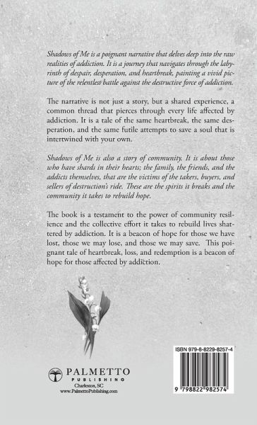 Unveiling the Heartbreak of Addiction: A Journey of Desperation, Loss, and Hope. A Tale of Community Resilience, Rebuilding Lives, and Saving Souls. Shadows of Me is a poignant mix of prose and poetry that delves deep into the raw realities of addiction. It is a journey that navigates through the labyrinth of despair, desperation, and heartbreak, painting a vivid picture of the relentless battle against the destructive force of addiction. The author, having lived through the harrowing experience, offers a unique perspective. The narrative is not just a story, but a shared experience, a common thread that pierces through every life affected by addiction. It is a tale of the same heartbreak, the same desperation, and the same futile attempts to save a soul that is part of your own. The book is a stark reminder of the harsh truth that we have no control over the wheel of addiction. It is like trying to steer a car from the outside, a car that is on a potentially deadly course. The author's experience resonates with the reader, much like David Sheff's Beautiful Boy, holding your hand through the journey, only to let it drop at the end, leaving you with a profound sense of loss and connection. Shadows of Me is also a story of community. It is about those who have shards in their hearts, the victims of addiction - the families, friends, and the addicts themselves. They are the victims of the takers, buyers, and sellers of destruction's ride. They are the spirits it breaks and the community it takes to rebuild hope. The book is a testament to the power of community resilience and the collective effort it takes to rebuild lives shattered by addiction. It is a beacon of hope for those we have lost, those we may lose, and those we may save. It is a tale of broken spirits and souls, a tale of desperation and loss, but also a tale of hope and redemption.