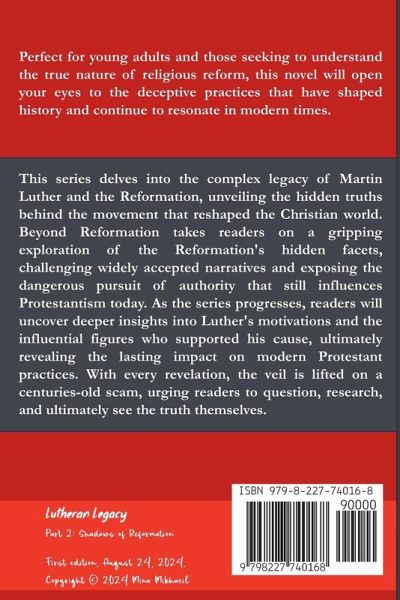 As the dust of history settles, the echoes of Martin Luther's Reformation continue to stir beneath the surface. But in "Shadows of Reformation," the second installment of the Lutheran Legacy series, the truth is far from simple. Luther's defiance against a corrupt Church ignited a revolution-but what of the man behind the myth? What shadows linger over the legacy he left behind? This book takes readers beyond the well-known events of the Reformation, plunging them into a world where the battle for faith intertwines with ambition, power, and deep internal conflict. It explores Luther's hidden struggles, his private fears, and the moral ambiguities that shaped both his actions and their lasting impact. As celestial and infernal forces alike observe and debate Luther's motives, the reader is drawn into a narrative that challenges the familiar story of a hero standing alone against an empire. Guided by the voices of powerful allies and supernatural beings, Luther's journey is reexamined through the lens of those who knew him best. His wife Katharina, his ambitions, and the unintended consequences of his Reformation come under scrutiny, peeling back the layers of myth to reveal the complex man underneath. "Shadows of Reformation" is not just a story about the Reformation; it's a profound exploration of the eternal human struggle between belief and ambition, righteousness and power. With each turn of the page, readers are invited to question the legacy of one of history's most enigmatic figures, where the lines between good and evil blur, and where the truth is anything but straightforward.