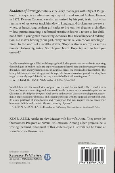 Shadows of Revenge continues the story that began with Days of Purgatory. The sequel is an adventure mystery set in and around Abilene, Kansas, in 1872. Deacon Coburn, a realist galvanized by his past, is startled when remnants of yesteryear track him down. Longing and brokenness are everywhere. A headstrong orphan girl seeks to live out her dreams; a childless widow pursues meaning; a reformed prostitute desires a return to her childhood faith; a young man makes tragic choices. It's a tale of hope and redemption. No matter how ugly our past, every individual can choose new beginnings. In the words of a stealthy drifter, ""Hope is always nearby, as sure as thunder follows lightning. Search your heart. Hope is there to lead you onward.""