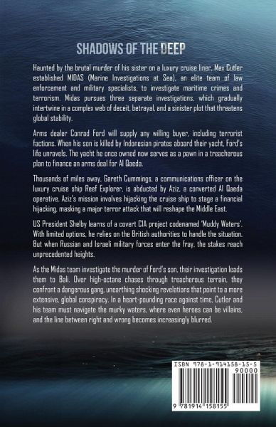 What lies beneath? Haunted by the brutal murder of his sister on a luxury cruise liner, Max Cutler established MIDAS (Marine Investigations at Sea), an elite team of law enforcement and military specialists, to investigate maritime crimes and terrorism. Midas pursues three separate investigations, which gradually intertwine in a complex web of deceit, betrayal, and a sinister plot that threatens global stability. Arms dealer Conrad Ford will supply any willing buyer, including terrorist factions. When his son is killed by Indonesian pirates aboard their yacht, Ford's life unravels. The yacht he once owned now serves as a pawn in a treacherous plan to finance an arms deal for Al Qaeda. Thousands of miles away, Gareth Cummings, a communications officer on the luxury cruise ship Reef Explorer, is abducted by Aziz, a converted Al Qaeda operative. Aziz's mission involves hijacking the cruise ship to stage a financial hijacking, masking a major terror attack that will reshape the Middle East. US President Shelby learns of a covert CIA project codenamed 'Muddy Waters'. With limited options, he relies on the British authorities to handle the situation. But when Russian and Israeli military forces enter the fray, the stakes reach unprecedented heights. As the Midas team investigate the murder of Ford's son, their investigation leads them to Bali. Over high-octane chases through treacherous terrain, they confront a dangerous gang, unearthing shocking revelations that point to a more extensive, global conspiracy. In a heart-pounding race against time, Cutler and his team must navigate the murky waters, where even heroes can be villains, and the line between right and wrong becomes increasingly blurred.