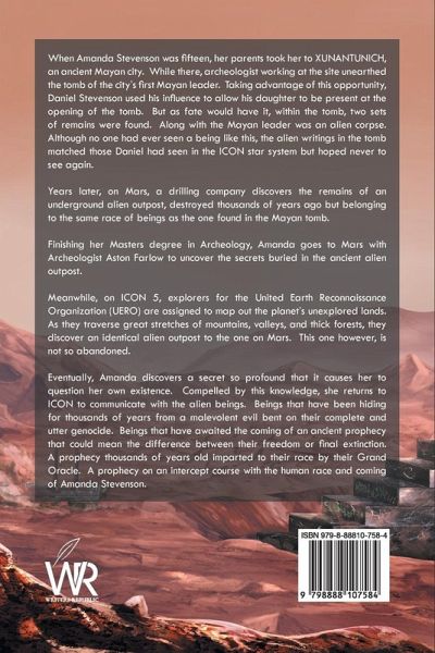 When Amanda Stevenson was fifteen, her parents took her to XUNANTUNICH, an ancient Mayan city. While there, archeologist working at the site unearthed the tomb of the city's first Mayan leader. Taking advantage of this opportunity, Daniel Stevenson used his influence to allow his daughter to be present at the opening of the tomb. But as fate would have it, within the tomb, two sets of remains were found. Along with the Mayan leader was an alien corpse. Although no one had ever seen a being like this, the alien writings in the tomb matched those Daniel had seen in the ICON star system but hoped never to see again. Years later, on Mars, a drilling company discovers the remains of an underground alien outpost, destroyed thousands of years ago but belonging to the same race of beings as the one found in the Mayan tomb. Finishing her Masters degree in Archeology, Amanda goes to Mars with Archeologist Aston Farlow to uncover the secrets buried in the ancient alien outpost. Meanwhile, on ICON 5, explorers for the United Earth Reconnaissance Organization (UERO) are assigned to map out the planet's unexplored lands. As they traverse great stretches of mountains, valleys, and thick forests, they discover an identical alien outpost to the one on Mars. This one however, is not so abandoned. Eventually, Amanda discovers a secret so profound that it causes her to question her own existence. Compelled by this knowledge, she returns to ICON to communicate with the alien beings. Beings that have been hiding for thousands of years from a malevolent evil bent on their complete and utter genocide. Beings that have awaited the coming of an ancient prophecy that could mean the difference between their freedom or final extinction. A prophecy thousands of years old imparted to their race by their Grand Oracle. A prophecy on an intercept course with the human race and coming of Amanda Stevenson.
