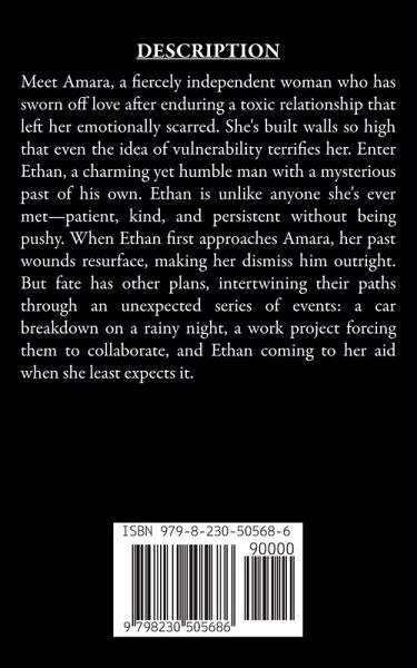 Meet Amara, a fiercely independent woman who has sworn off love after enduring a toxic relationship that left her emotionally scarred. She's built walls so high that even the idea of vulnerability terrifies her. Enter Ethan, a charming yet humble man with a mysterious past of his own. Ethan is unlike anyone she's ever met-patient, kind, and persistent without being pushy. When Ethan first approaches Amara, her past wounds resurface, making her dismiss him outright. But fate has other plans, intertwining their paths through an unexpected series of events: a car breakdown on a rainy night, a work project forcing them to collaborate, and Ethan coming to her aid when she least expects it.