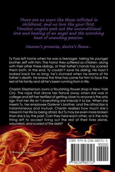 Ty Foxx left home when he was a teenager, taking his brother Jeff with him. The horror they'd suffered as children, along with their other three siblings, at their father's hands has scarred them both. Ty had tried to take care of and shelter his younger brother, eventually becoming a successful photographer, but in the end he couldn't save him. He hasn't looked back for so long, he's stunned when he learns that his father succumbed to an illness that plagued him for years. The threat and terror he posed is over, dead and gone. Even though Ty is filled with self-loathing and fury at the past with the loss of his brother, he knows the time has come for him to go home and face the rest of his family and all that he's been running from in life. Cherish Stephenson owns a flourishing flower shop and mail-order business. The rape that drove her fiance away when she was in college and left her terrified of getting close to anyone is the only sign that her life isn't everything and all she intends it to be. When she meets Ty, her employee Darlene's brother, and the attraction is instantaneous and mutual, Cherish realizes how much she's missed in her life by being afraid of the shadows of the night. But Ty may be even more broken than she is by the past. Can they heal each other with the light of love, or is the only thing left for both of them to accept living out the rest of their lives alone, wounded, and scared of the dark?