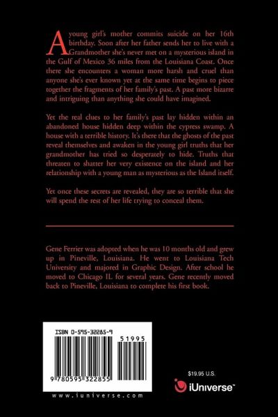 A young girl's mother commits suicide on her 16th birthday. Soon after her father sends her to live with a Grandmother she's never met on a mysterious island in the Gulf of Mexico 36 miles from the Louisiana Coast. Once there she encounters a woman more harsh and cruel than anyone she's ever known yet at the same time begins to piece together the fragments of her family's past. A past more bizarre and intriguing than anything she could have imagined. Yet the real clues to her family's past lay hidden within an abandoned house hidden deep within the cypress swamp. A house with a terrible history. It's there that the ghosts of the past reveal themselves and awaken in the young girl truths that her grandmother has tried so desperately to hide. Truths that threaten to shatter her very existence on the island and her relationship with a young man as mysterious as the Island itself. Yet once these secrets are revealed, they are so terrible that she will spend the rest of her life trying to conceal them.