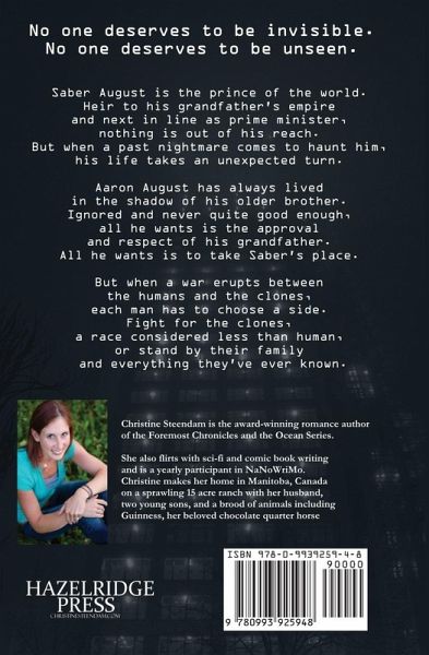 No one deserves to be invisible. No one deserves to be unseen. Saber August is the prince of the world. Heir to his grandfather's empire and next in line as prime minister, nothing is out of his reach. But when a past nightmare comes to haunt him, his life takes an unexpected turn. Aaron August has always lived in the shadow of his older brother. Ignored and never quite good enough, all he wants is the approval and respect of his grandfather. All he wants is to take Saber's place. But when a war erupts between the humans and the clones, each man has to choose a side. Fight for the clones, a race considered less than human, or stand by their family and everything they've ever known.