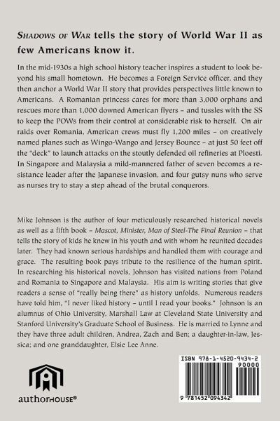 Shadows of War tells the story of World War II as few Americans know it. In the mid-1930s a high school history teacher inspires a student to look beyond his small hometown. He becomes a Foreign Service officer, and they then anchor a World War II story that provides perspectives little known to Americans. A Romanian princess cares for more than 3,000 orphans and rescues more than 1,000 downed American flyers - and tussles with the SS to keep the POWs from their control at considerable risk to herself. On air raids over Romania, American crews must fly 1,200 miles - on creatively named planes such as Wingo-Wango and Jersey Bounce - at just 50 feet off the "deck" to launch attacks on the stoutly defended oil refineries at Ploesti. In Singapore and Malaysia a mild-mannered father of seven becomes a resistance leader after the Japanese invasion, and four gutsy nuns who serve as nurses try to stay a step ahead of the brutal conquerors.