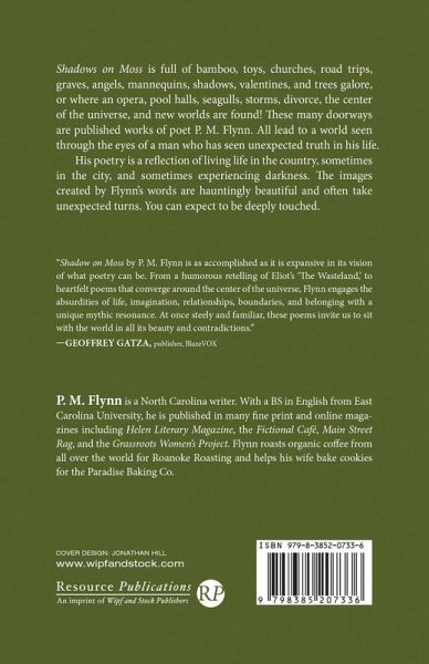 Shadows on Moss is full of bamboo, toys, churches, road trips, graves, angels, mannequins, shadows, valentines, and trees galore, or where an opera, pool halls, seagulls, storms, divorce, the center of the universe, and new worlds are found! These many doorways are published works of poet P. M. Flynn. All lead to a world seen through the eyes of a man who has seen unexpected truth in his life. His poetry is a reflection of living life in the country, sometimes in the city, and sometimes experiencing the darkness. The images created by Flynn's words are hauntingly beautiful and often take unexpected turns. You can expect to be deeply touched.