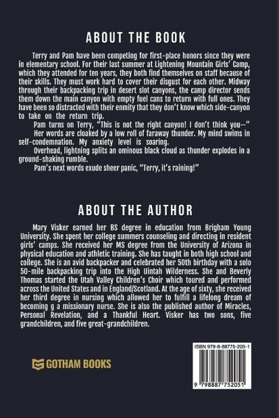 Terry and Pam have been embroiled in heated competition since third grade. This summer they are returning to Lightning Mountain camp as staff members. They are both assistant unit leaders in the two outback units. Terry plans to hide her animosity for Pam by being totally involved with her girls in preparing for their two week backpacking adventure and avoiding her altogether. She is distraught when she learns that both outback units are going together to explore desert slot canyons. At mid-trip, the camp Director assigns Terry and Pam the task of carrying empty fuel cans down the canyon to trail's end and bringing back full ones for their last week. Their enmity is so intense that neither speaks to the other the entire five mile trip down the canyon hiking in the water. They have been so distracted and turned-in that neither girl knows which side canyon to take to return to their base camp at Big Springs. Terry finally leads them up one canyon that might be the right one. After a half-hour of arduous plodding they both know they're lost in a stream with the canyon wall raising five hundred feet straight into the sky. Pam turns on Terry, "Terry, this is not the right canyon! I don think you...'' "Her words are cloaked by a low roll of faraway thunder. Both of our heads snap up to see the distant mountains covered in angry black clouds. My mind swims in self-condemnation. Why have you not been paying attention to the canyon or the weather. Why!? My anxiety level is soaring. "Overhead, lightning splits an ominous thunderhead simultaneously as thunder explodes in a ground-shaking rumble. "Pam's next words exude sheer panic, 'Terry, it's raining!''