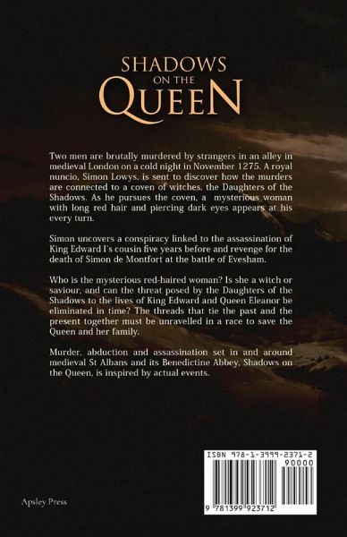 Two men are brutally murdered by strangers in an alley in medieval London on a cold night in November 1275. A royal nuncio, Simon Lowys, is sent to discover how the murders are connected to a coven of witches, the Daughters of the Shadows. As he pursues the coven, a mysterious woman with long red hair and piercing dark eyes appears at his every turn. Simon uncovers a conspiracy linked to the assassination of King Edward I's cousin five years before and revenge for the death of Simon de Montfort at the battle of Evesham. Who is the mysterious red-haired woman? Is she a witch or saviour, and can the threat posed by the Daughters of the Shadows to the lives of King Edward and Queen Eleanor be eliminated in time? The threads that tie the past and the present together must be unravelled in a race to save the Queen and her family. Murder, abduction and assassination set in and around medieval St Albans and its Benedictine Abbey, Shadows on the Queen, is inspired by actual events.