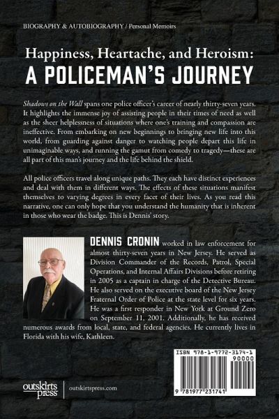 SHADOWS ON THE WALL: ONE POLICEMAN'S JOURNEY "I'll never forget that July morning. It was almost ninety-five degrees at 11:00 am. As I walked into the Jefferson Township Police Department, I looked straight into the eyes of the desk sergeant and asked, "Where do I go to take the test for a police officer?" Six weeks later, I was standing in the office of the mayor with my hand raised, taking the Oath of Allegiance. As I looked around the room, my eyes caught my father. Tears were rolling down his face. He looked so proud as he held my mother's hand, but there was a completely different look on her face. It was a look of fear and concern, with a hint of pride. I knew my life would never be the same again." The world was a different place when the author began his career in law enforcement more than fifty years ago. Police officers were respected, life was simpler, technology was undeveloped, populations were smaller, and tactics were sometimes unconventional - but the community's citizens knew they could depend upon the police when they were needed. Beginning with the grueling days of police academy training and continuing through decades of dealing with fierce feral dogs and wild biker brawls, domestic disturbances and delivered babies, house fires and hostage situations, brutal murders and terrorist attacks, these stories are told with details that are indicative of a longtime police officer's discerning observations. They illustrate the irreverent humor and strong relationships forged that served to ease the stresses of long hours, heartbreaking tragedy, infuriating injustice, and constant vigilance. They also reflect the respect he earned for his dedication and service amid the difficulties and dangers of law enforcement, and the impact those events had on every facet of his life for years to come. This is a summary of the events and the people who, together, cast their shadows on the wall of one officer's life.