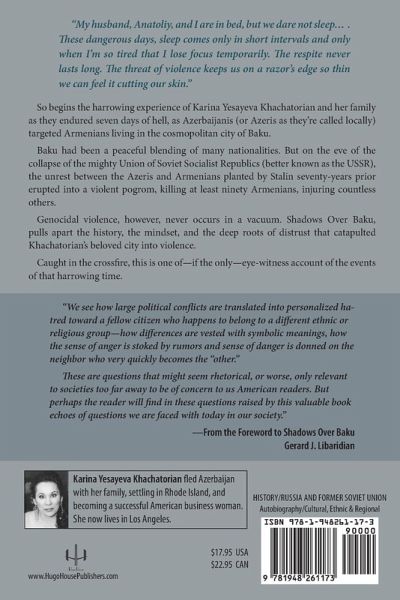 "My husband, Anatoliy, and I are in bed, but we dare not sleep...These dangerous days, sleep comes only in short intervals and only when I'm so tired that I lose focus temporarily. The respite never lasts long. The threat of violence keeps us on a razor's edge so thin we can feel it cutting our skin." So begins the harrowing experience of Karina Yesayeva Khachatorian and her family as they endured seven days of hell, as Azerbaijanis (or Azeris as they're called locally) targeted Armenians living in the cosmopolitan city of Baku. Baku had been a peaceful blending of many nationalities. But on the eve of the collapse of the mighty Union of Soviet Socialist Republics (better known as the USSR), the unrest between the Azeris and Armenians planted by Stalin seventy-years prior erupted into a violent pogrom, killing at least ninety Armenians, injuring countless others. Genocidal violence, however, never occurs in a vacuum. Shadows Over Baku pulls apart the history, the mindset, and the deep roots of distrust that catapulted Khachatorian's beloved city into violence. Caught in the crossfire, this is one of-if the only-eye-witness account of the events of that harrowing time.