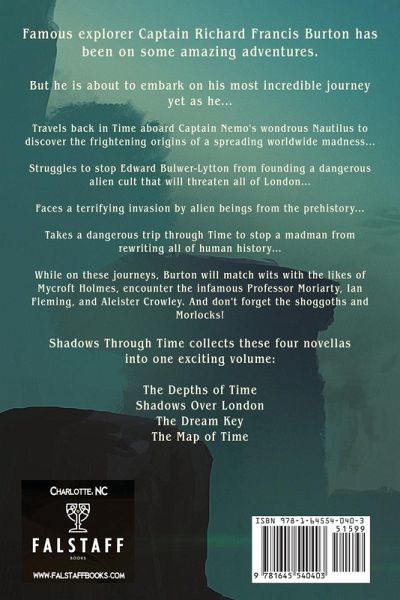 Famous explorer Captain Richard Francis Burton has been on some amazing adventures. But he is about to embark on his most incredible journey yet as he... Travels back in Time aboard Captain Nemo's wondrous Nautilus to discover the frightening origins of a spreading worldwide madness... Struggles to stop Edward Bulwer-Lytton from founding a dangerous alien cult that will threaten all of London... Faces a terrifying invasion by alien beings from the prehistory... Takes a dangerous trip through Time to stop a madman from rewriting all of human history... While on these journeys, Burton will match wits with the likes of Mycroft Holmes, encounter the infamous Professor Moriarty, Ian Fleming, and Aleister Crowley. And don't forget the shoggoths and Morlocks! Shadows Through Time collects these four novellas into one exciting volume: The Depths of Time Shadows Over London The Dream Key The Map of Time
