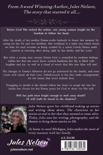 Before Civil War rocked the nation, one young woman fought for the freedom to follow her heart. After the death of her mother, Emma works tirelessly to honor her memory by caring for her Da and two brothers. Her workload is a hefty one, which leaves no time for such luxuries as being courted by a suitor. Lonely, Emma seeks comfort in knowing she's doing right by her family and her Lord. But when a young man rescues Emma from a scoundrel, he awakens feelings within her that she never knew existed. Suddenly, her life is filled with laughter and joy- as well as a cloud of worry that this new bliss will end. The changes in Emma's behavior do not go unnoticed by her family, and soon create civil unrest all their own. Unbeknownst to her, they make arrangements for her future that won't include love. Struggling to decide if she should follow her heart or accept the fate her family has chosen for her, Emma prays for God to show her His will. Will her path burn bright enough to melt away doubt? Or will truth be found in the shadows?