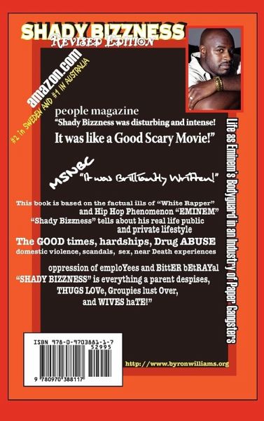 People Magazine"Shady Bizzness was disturbing and intense! It was like a good scary movie!" MSNBC"It was brilliantly written!" Book DescriptionThis story is based on the factual ills of "white rapper" and Hip-Hop phenomenon, "Eminem". "Shady Bizzness" tell about real life events of his public and private lifestyle. The book details the good times, hardships, drug abuse, domestic violence, scandals, sex, near-death experiences, murder, oppression of employees and bitter betrayl. "Shady Bizzness" is everything a parent despises, thugs love, groupies lust over, and wives hate!