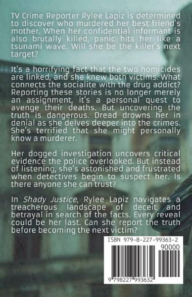 TV Crime Reporter Rylee Lapiz is determined to discover who murdered her best friend's mother. When her confidential informant is also brutally killed, panic hits her like a tsunami wave. Will she be the killer's next target? It's a horrifying fact that the two homicides are linked, and she knew both victims. What connects the socialite with the drug addict? Reporting these stories is no longer merely an assignment, it's a personal quest to avenge their deaths. But uncovering the truth is dangerous. Dread drowns her in denial as she delves deeper into the crimes. She's terrified that she might personally know a murderer. Her dogged investigation uncovers critical evidence the police overlooked. But instead of listening, she's astonished and frustrated when detectives begin to suspect her. Is there anyone she can trust? In Shady Justice, Rylee Lapiz navigates a treacherous landscape of deceit and betrayal in search of the facts. Every reveal could be her last. Can she report the truth before becoming the next victim?