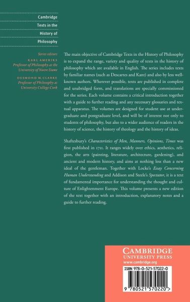 Shaftesbury's Characteristics of Men, Manners, Opinions, Times was first published in 1711. It ranges widely over ethics, aesthetics, religion, the arts (painting, literature, architecture, gardening), and ancient and modern history, and aims at nothing less than a new ideal of the gentleman. Together with Locke's Essay Concerning Human Understanding and Addison and Steele's Spectator, it is a text of fundamental importance for understanding the thought and culture of Enlightenment Europe. This volume, first published in 2000, presents an edition of the text together with an introduction, explanatory notes and a guide to further reading.