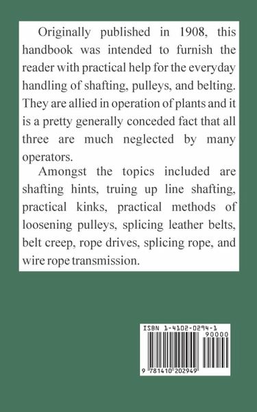 Originally published in 1908, this handbook was intended to furnish the reader with practical help for the everyday handling of shafting, pulleys, and belting. They are allied in operation of plants and it is a pretty generally conceded fact that all three are much neglected by many operators. Amongst the topics included are shafting hints, truing up line shafting, practical kinks, practical methods of loosening pulleys, splicing leather belts, belt creep, rope drives, splicing rope, and wire rope transmission.