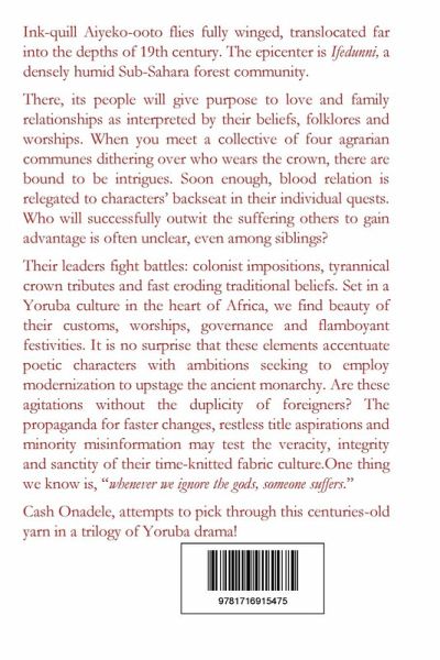SHAFTS OF ARROWS PIERCE WITS. Cash Onadele "Aiyeko-ooto" has mastered the art of fictional drama. It shows in the characters and tales of the Yoruba ancient cultures and traditions depicted in this trilogy. In "Blood and Arrows of Wits" part 1: he pulled on every human emotion to captivate our thoughts. This imaginative story telling left no stones unturned. Weaving the ways of mortals and the acts of gods to make magical, yet, believable! In this part 2: Shafts of Arrows Pierce Wits: again, we are translocated back to the deep jungles of forests of sub-sahara, Africa. Where the characters bring to life ordinary ways of men living centuries ago. What keeps their lives turning up as strange super ordinary events? There was hate, discord, ambition, greed and love. No more than we see in present day. However, if their powerful gods and goddesses weren't mixed in their mortal affairs, ghosts were. If you think politics and social change are modern sciences, you are in for a surprise of their practiced arts almost perfected in the struggle for reign. This combined with their sense of traditional governance and values become necessary tools to defend against attacks of foreign colonists under clouds of transforming culture. Even today, as long as there are rulers and the ruled, agitators of a few disgruntled natives have a crack to peddle the bought influence of foreign imperialists. We shall meet again in final part of this fictional drama trilogy!