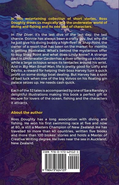 A perfect gift or escape for lovers of the ocean, fishing and the characters it attracts In this entertaining collection of short stories, Ross Doughty draws us magically into the underwater world of diving and fishing and its odd cast of characters. In The Diver, it's the last dive of the last day, the last chance. Donnie has always been a crafty guy, but why did he just give his diving buddy a high-five? In Shag Point, the owner of a resort that has been on the market for months is getting frustrated. What's behind the mysterious offer to buy Shag Point and what does Lindy know? A strange pact in Underwater Garden has a diver offering up a lobster while a large octopus wraps its tentacles around his wrist. And in Big Man Small Man, life is pretty good for Lofty and Devito, a reward for helping their boss Harvey turn a quick profit on some dodgy boat dealing. But Harvey has a spot of bad luck when one of the big Volvos on his floating gin palace seizes up. He needs cash quick. Each of the 32 tales is accompanied by one of Sara Ransley's delightful illustrations making this book a perfect gift or escape for lovers of the ocean, fishing and the characters it attracts.