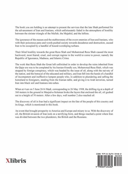 The book you are holding is an attempt to present the services that the late Shah performed for the advancement of Iran and Iranians, which unfortunately faded in the atmosphere of hostility between the sinister triangle of the Mullah, the Mujahid, and the leftists. The ignorance of the masses and the stubbornness of the sworn enemies of Iran and Iranians, who with their poisonous pens and words pushed society towards decadence and destruction, caused Iran to be occupied by a handful of hound-worshiping turbans. Their blind hostility towards the great Reza Shah and Mohammad Reza Shah caused the most backward, most feared, cruel, and corrupt regime in the world to come to power, namely the Republic of Ignorance, Madness, and Islamic Crime. The work that Reza Shah the Great left unfinished in order to develop the ruins inherited from the Qajar era was to be completed by his Iranian-friendly son, Mohammad Reza Shah, which was stopped by foreign conspiracy, which was headed by the issue of oil, along with the naivety of the nation, and the betrayal of the educated and military, and Iran fell into the hands of a handful of incompetent and ineffective lumpen people who, in addition to plundering and selling the homeland to foreigners, stealing from the Iranian table, and giving it to Arab terrorists, turned Iran into black soil and Iranians into ashes. When at 4 am on 5 June 2616 Madi, corresponding to 26 May 1908, the drilling rig at a depth of 360 meters in the ground in Masjed-e-Soleman broke the layers that enclosed the oil, oil gushed out to a height of 50 meters. After a few days, well number 2 also reached oil. The discovery of oil in Iran had a significant impact on the fate of the people of this country and its kings, which is mentioned in this book. An event that brought prosperity to America and Europe and misery to us. With the discovery of oil, the British invasion of Iran took on a terrifying form, and things reached a point where Iran was divided between the two plunderers, the British and the Russians.