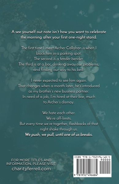 A see yourself out note isn't how you want to celebrate the morning after your first one-night stand. The first time I meet Archer Callahan is when I block him in a parking spot. The second is a fender bender. The third is at a bar, drinking away our problems, and finding our way to his bed. I never expected to see him again. That changes when a month later, he's introduced as my brother's new business partner. In need of a job, I'm hired at their bar, much to Archer's dismay. We hate each other. We're off-limits. But every time we're together, flashbacks of that night shake through us. We push, we pull, until one of us breaks.