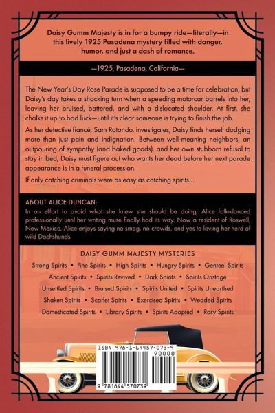 Pasadena Matron Struck and Injured by Motorcar at Rose Parade in Shaken Spirits, a Cozy Historical Mystery by Alice Duncan January, 1925 Daisy Gumm Majesty, her family and fiancé, Sam Rotondo--detective with the Pasadena Police Department--are leaving the Tournament of Roses Parade when Daisy is struck by a passing motorcar. Although scratched, bruised and with a dislocated shoulder, the outcome could have been much worse were it not for Sam's quick action. But the pain and discomfort are quickly replaced by something worse when it becomes obvious that this was no accident--someone wants Daisy dead. Unfortunately, the would-be-killer is not easily discouraged and it's going to take all the investigative savvy Daisy and Sam can muster to save Daisy's life. From the Publisher: The Daisy Gumm Majesty Cozy Mystery Series is a light-hearted mystery in a historical setting. There are no explicit sexual scenes and minimal cursing and will be enjoyed by readers who appreciate clean and wholesome reads. PRAISE for THE DAISY GUMM MAJESTY MYSTERIES "Well plotted with a band of whimsical characters and genuine humor..." ~Diane Morasco, RT Book Reviews THE DAISY GUMM MAJESTY MYSTERIES, in series order Strong Spirits Fine Spirits High Spirits Hungry Spirits Genteel Spirits Ancient Spirits Dark Spirits Spirits Onstage Unsettled Spirits Bruised Spirits Spirits United Spirits Unearthed Shaken Spirits