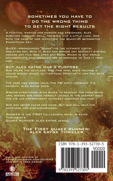 Alex Kayne wanted to make the world a better, safer place for everyone-now she's on the run. A fugitive, wanted for murder and epsionage, Alex survives through skill, training, and a little luck. And with the help of her invention: the Quantum Integrated Encryption Key. QuIEK-pronounced "Quake"-is the ultimate digital skeleton key. With it, Alex can bypass any security system, access any file, and open any door. Which is why world governments and agencies are determined to take it from her. But Alex Kayne has a purpose... She helps the helpless. And this time, she's helping a young woman whose cutting-edge prosthetic arm has been stolen. The case has grown cold. The FBI don't consider it a priority. Alex Kayne does. Risking everything, Alex races to recover the prosthetic arm, before she finds herself locked in the deepest hole the US law enforcmeent alphabet agencies can find. She may never clear her name. But she will help the hopeless and disenfranchised. Read Book One of QUAKE RUNNER: ALEX KAYNE And find more thrills at HistoricCrimes.com
