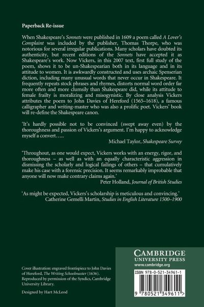 When Shakespeare's Sonnets were published in 1609 a poem called A Lover's Complaint was included by the publisher, Thomas Thorpe, who was notorious for several irregular publications. Many scholars have doubted its authenticity, but recent editions of the Sonnets have accepted it as Shakespeare's work. Now Vickers, in this text, the first full study of the poem, shows it to be un-Shakespearian both in its language and in its attitude to women. It is awkwardly constructed and uses archaic Spenserian diction, including many unusual words that never occur in Shakespeare. It frequently repeats stock phrases and rhymes, distorts normal word order far more often and more clumsily than Shakespeare did, while its attitude to female frailty is moralizing and misogynistic. By close analysis Vickers attributes the poem to John Davies of Hereford (1565-1618), a famous calligrapher and writing-master who was also a prolific poet. Vickers' book will re-define the Shakespeare canon.