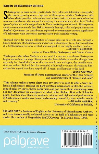 PART ONE: QUESTIONS OF SHAKESPEARE'S CULTURAL AUTHORITY To e- or Not To e-? Disposing of Shakespeare in the Age of Electronic Mass Media; R.Burt Bardguides of the New Universe: Niche Marketing and the Cultural Logic of Late Shakespeareanism; D.K.Hedrick 'In Fair Verona': Media, Spectacle, and Performance in William Shakespeare's Romeo and Juliet ; P.Donaldson We are the Makers of Manners: The Branagh Phenomenon; M.Thorton Burnett Shakespeare: The Theme Park; D. E.Henderson Harlequin Presents: That '70s Shakespeare and Beyond; L.Osborne Suggested for Mature Readers? Deconstructing Shakespearean Value in Comic Books; J.Heuman & R.Burt The Shatnerification of Shakespeare: Star Trek and the Commonplace Tradition; C.Dionne WSHX: Shakespeare and American Radio; D.Lanier Shakespeare, Bard of Avon; F.Teague Reviving Juliet, Repackaging Romeo: Transformations of Character in Popular Music Lyrics; S.M.Buhler The Making of Authorships: Transversal Navigation in the Wake of Hamlet ; D.J.Hopkins & B.Reynolds Bartlett's Evolving Shakespeare; H.Whall Afterword: Shakespeare and the Holocaust: Julie Taymor's Titus is Beautiful, or Shakesploi Meets the Camp; R.Burt