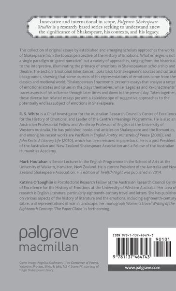 Acknowledgments Notes on Contributors 1. Reclaiming Heartlands: Shakespeare And The History Of Emotions In Literature; R. S. White PART I: EMOTIONAL INHERITANCES 2. 'Of Comfort And Dispaire': Plato's Philosophy Of Love And Shakespeare's Sonnets; Danijela Kambaskovic 3. Locus Amoenus Or Locus Violens? Shakespearean Emotions Expressed Through An Ovidian Model; Bríd Phillips 4. Once Upon A Time: Cymbeline, Fairy Tales, And 'The Terrifying Truths Of The Inner Life'; Ciara Rawnsley 5. ' Another Comfort': Virginity And Emotion In Measure For Measure; Andrew Lynch 6. French Feeling: Language, Sex And Identity In Henry V; Stephanie Downes 7. Power, Vulnerability And Sexuality: Representations Of Margaret Of Anjou In A London Chronicle And Shakespeare's 3 Henry VI; Mary-Rose McLaren PART II: SHAKESPEAREAN ENACTMENTS 8. 'My Heart Dances': Performing Emotion Through Shakespeare's Rhythms; Peter Groves 9. 'The Teares Of Ten Thousand Spectators': Shakespeare's Experiments With Emotion From Talbot To Richard II; Ruth Lunney 10. Emotional Education And Leadership In The Henriad; Martin Dawes 11. 'Say How I Loved You': Queering The Emotion Of Male Same-Sex Love In The Merchant Of Venice; Anthony Guy Patricia 12. Making A Virtue Of Giddiness: Rethinking Troilus' (E)Motion; Alison V. Scott 13. 'I Shall Split All / In Pleasure Of My Spleen!': Troilus And Cressida And The Expression Of Emotion; Ronald Bedford 14. Displacement: Maps And Emotions In Othello; Christopher Wortham 15. Lear In The Storm: Shakespeare's Emotional Exploration Of Sovereign Mortality; Jennifer Hamilton 16. 'Sociable' Tears In The Tempest; Heather Kerr PART III: EMOTIONAL LEGACIES AND RE-ENACTMENTS 17. Only Connect: Dramaturgy And A Living Shakespeare; Philippa Kelly 18. Cabbages And Kings: Curating The Objects And Emotions Of English Encounter With The World Through Shakespeare; Susan Broomhall 19. 'Tis Master's Voice: A Seventeenth-Century Shakespeare Recording?; Andrew Lawrence-King 20. Recognition In Shakespeare And Hegel; Simon Haines 21. 'The Days That We Have Seen': History And Regret In Henry IV, Parts One And Two And The Hollow Crown (2012); Rosemary Gaby 22. Whose Nostalgia? Geoffrey Rush And The Merry Wives Of Windsor, Brisbane 1987; Elizabeth Schafer 23. Afterword; Mark Houlahan Selective Bibliography Index