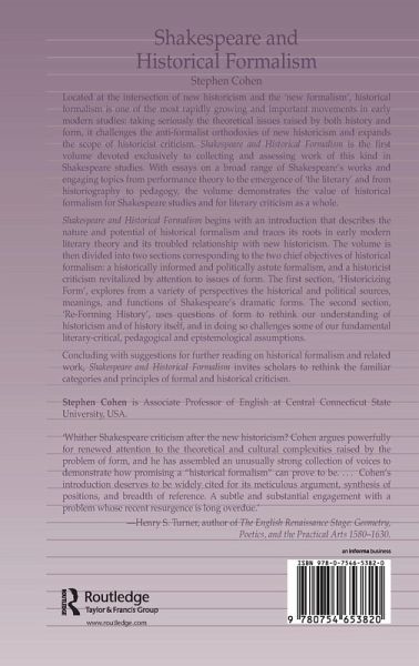 Located at the intersection of new historicism and the 'new formalism', historical formalism is one of the most rapidly growing and important movements in early modern studies: taking seriously the theoretical issues raised by both history and form, it challenges the anti-formalist orthodoxies of new historicism and expands the scope of historicist criticism. Shakespeare and Historical Formalism is the first volume devoted exclusively to collecting and assessing work of this kind. With essays on a broad range of Shakespeare's works and engaging topics from performance theory to the emergence of 'the literary' and from historiography to pedagogy, the volume demonstrates the value of historical formalism for Shakespeare studies and for literary criticism as a whole. Shakespeare and Historical Formalism begins with an introduction that describes the nature and potential of historical formalism and traces its roots in early modern literary theory and its troubled relationship with new historicism. The volume is then divided into two sections corresponding to the two chief objectives of historical formalism: a historically informed and politically astute formalism, and a historicist criticism revitalized by attention to issues of form. The first section, 'Historicizing Form', explores from a variety of perspectives the historical and political sources, meanings and functions of Shakespeare's dramatic forms. The second section, 'Re-Forming History', uses questions of form to rethink our understanding of historicism and of history itself, and in doing so challenges some of our fundamental literary-critical, pedagogical and epistemological assumptions. Concluding with suggestions for further reading on historical formalism and related work, Shakespeare and Historical Formalism invites scholars to rethink the familiar categories and principles of formal and historical criticism.