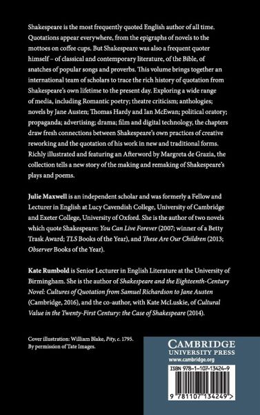 Shakespeare is the most frequently quoted English author of all time. Quotations appear everywhere, from the epigraphs of novels to the mottoes on coffee cups. But Shakespeare was also a frequent quoter himself - of classical and contemporary literature, of the Bible, of snatches of popular songs and proverbs. This volume brings together an international team of scholars to trace the rich history of quotation from Shakespeare's own lifetime to the present day. Exploring a wide range of media, including Romantic poetry, theatre criticism, novels by Jane Austen, Thomas Hardy and Ian McEwan, political oratory, propaganda, advertising, drama, film and digital technology, the chapters draw fresh connections between Shakespeare's own practices of creative reworking and the quotation of his work in new and traditional forms. Richly illustrated and featuring an Afterword by Margreta de Grazia, the collection tells a new story of the making and remaking of Shakespeare's plays and poems.