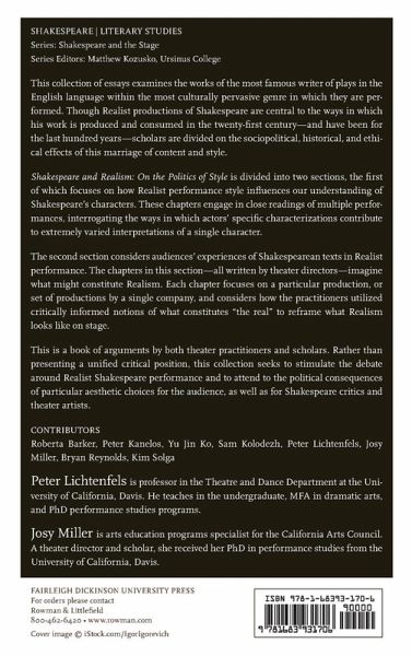This collection of essays examines the works of the most famous writer of plays in the English language within the most culturally pervasive genre in which they are performed. Though Realist productions of Shakespeare are central to the ways in which his work is produced and consumed in the 21st century-and has been for the last 100 years-scholars are divided on the socio-political, historical, and ethical effects of this marriage of content and style. The book is divided into two sections, the first of which focuses on how Realist performance style influences our understanding of Shakespeare's characters. These chapters engage in close readings of multiple performances, interrogating the ways in which actors' specific characterizations contribute to extremely varied interpretations of a single character. The second section then considers audiences' experiences of Shakespearean texts in Realist performance. The essays in this section-all written by theatre directors-imagine out what might constitute Realism. Each chapter focuses on a particular production, or set of productions by a single company, and considers how the practitioners utilized critically informed notions of what constitutes "the real" to reframe what Realism looks like on stage. This is a book of arguments by both theatre practitioners and scholars. Rather than presenting a unified critical position, this collection seeks to stimulate the debate around Realist Shakespeare performance, and to attend to the political consequences of particular aesthetic choices for the audience, as well as for Shakespeare critics and theatre artists.