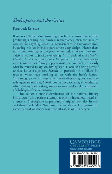 If we read Shakespeare assuming that he is a consummate artist producing nothing but flawless masterpieces, then we have to account for anything which is inconsistent with that assumption by saying it is an intended part of the deep design. Mr French asks whether Shakespeare wasn't sometimes frankly opportunist, or couldn't see clearly what he wanted to say, or, having seen it, couldn't bring himself to face its consequences. Hamlet in particular is a failure for reasons which have nothing to do with the hero's famous 'psychology'; Lear is much more disturbing than the redemptivists make it; Othello comes close to being a melodrama; while Antony wavers dangerously in tone and in the seriousness of Shakespeare's involvement. This is not a simple devaluation of the national literary institution. It is a patient attempt at open-mindedness, based on a sense of Shakespeare as profoundly original but also human and therefore fallible.