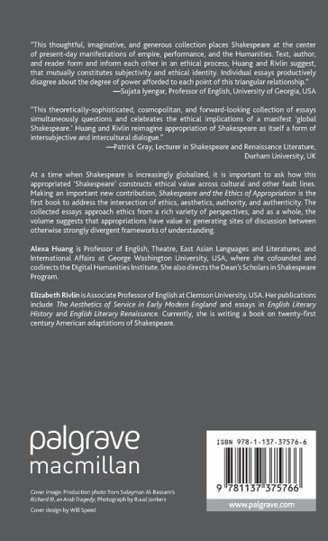 "This thoughtful, imaginative, and generous collection takes us beyond the simple identification of Shakespearean appropriation as a field of study in order to place Shakespeare at the center of present-day manifestations of empire, performance, and the humanities. Text, author, and reader form and inform each other in an ethical process, Rivlin and Huang suggest, that mutually constitutes subjectivity and ethical identity. Individual essays productively disagree about the degree of power afforded to each point of this triangular relationship - text, author, reader - but communicate an urgent and compelling need for adaptors, readers, and viewers to reflect upon what 'Shakespeare' means in each of these context and to consider the social and ethical stakes of each of these positions." - Sujata Iyengar, Professor of English, University of Georgia, USA