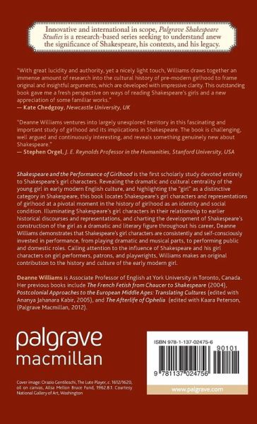 "Shakespeare and the Performance of Girlhood opens new doors for future studies ofthe legacy of Shakespeare and childhood. It is a text invested in Shakespeare studies, social histories, literary theory, and feminist studies that advances each of these fields. Williams's analyses and contextualizations of the works in question offer original ways of understanding the girls in Shakespeare's works and how such works went on to influence the modern understanding of girls and girlhood." (M. Tyler Sasser, Early Theatre, Vol. 19 (1), June, 2016)