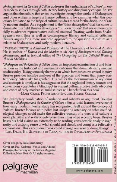 The last two decades have witnessed a profound change in the way we receive the literary texts of early modern England. One could call this a move from 'text' to 'culture'. Put briefly, earlier critics tended to focus on literary texts, strictly conceived: plays, poems, prose fictions, essays. Since the mid-1980s, however, it has been just as likely for critics to speak of the 'culture' of early modern England, even when they do so in conjunction with analysis of literary texts. This 'cultural turn' has clearly enriched the way in which we read the texts of early modern England, but the interdisciplinary practices involved have frequently led critics to make claims about materials - and about the 'culture' these materials appear to embody - that exceed those materials' representativeness. Shakespeare and the Question of Culture addresses the central issue of 'culture' in early modern studies through both literary history and disciplinary critique. Douglas Bruster argues that the 'culture' literary critiques investigate through the works of Shakespeare and other writers is largely a literary culture, and he examines what this necessary limitation of the scope of 'cultural studies' means for the discipline of early modern studies.