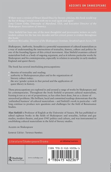 Shakespeare, Authority, Sexuality is a powerful reassessment of cultural materialism as a way of understanding textuality, history and culture, by one of the founding figures of this critical movement. Alan Sinfield examines cultural materialism both as a body of ongoing argument and as it informs particular works by Shakespeare and his contemporaries, especially in relation to sexuality in early-modern England and queer theory.