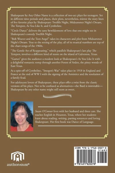 Shakespeare by Any Other Name is a collection of two-act plays for teenagers. Set in different time periods and places, their plots, nevertheless, mirror the story lines of five favorite plays by Shakespeare: Twelfth Night, Midsummer Night's Dream, The Tempest, As You Like It, and Cymbeline. "Circle Dance" delivers the zany bewilderment of love that one might see in Shakespeare's comedy Twelfth Night. "Bob Weaver and the Teen Angel" takes its characters and plot from Midsummer Night's Dream. True to the setting of the play, all of its musical numbers are top of the chart songs of the 1960s. "The Gentle Art of Reappearing," which parallels Shakespeare's last play The Tempest, involves a different kind of storm on the island of Galveston, Texas. "Games" gives the audience a modern look at Shakespeare's As You Like It with a delightful romantic romp through another Forest of Arden, the piney woods of East Texas. As a spin-off of Cymbeline, "Imogen's War" takes place in 1918 in England and France at the end of WW I with the signing of the Armistice and the resolution of a family feud. For adolescent lovers of Shakespeare, these plays offer a twist from the classic versions of his plays. Not to be confused as alternatives-the Bard is inimitable-Shakespeare by any other name might still seem as sweet.