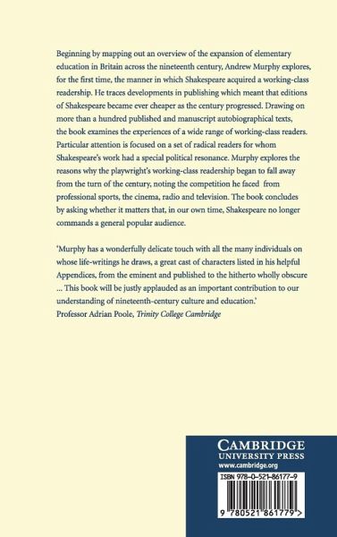 Beginning by mapping out an overview of the expansion of elementary education in Britain across the nineteenth century, Andrew Murphy explores the manner in which Shakespeare acquired a working-class readership. He traces developments in publishing which meant that editions of Shakespeare became ever cheaper as the century progressed. Drawing on more than a hundred published and manuscript autobiographical texts, the book examines the experiences of a wide range of working-class readers. Particular attention is focused on a set of radical readers for whom Shakespeare's work had a special political resonance. Murphy explores the reasons why the playwright's working-class readership began to fall away from the turn of the century, noting the competition he faced from professional sports, the cinema, radio and television. The book concludes by asking whether it matters that, in our own time, Shakespeare no longer commands a general popular audience.